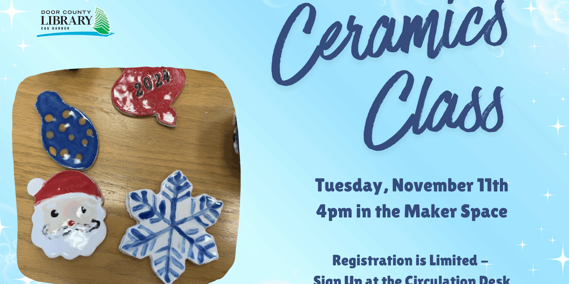 We will be making ceramic Christmas decorations/ornaments!! Registration is limited to 15. Geared toward adults, teens and kids with adult supervision.