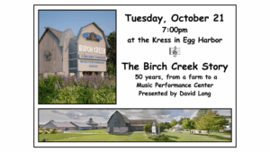 October 21st – “The Birch Creek Story”. 50 years, from a farm to a Music Performance Center presented by David Long.