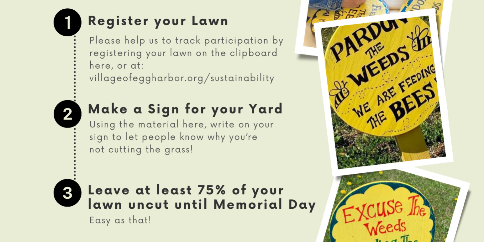 Stop by the Maker Space during the month of April to create your own No Mow May Sign. Donate Here Post navigationPreviousPrevious post:Reusable Green Tier Bag DonationNextNext post:Every Day is Earth Day Fest 2024Related postsReusable Green Tier Bag DonationMarch 24, 2024Pollinator Plant SaleMarch 24, 2023May 18-21: Egg Harbor Community Clean-up!March 8, 2023Every Day is Earth Day Festival 2023March 4, 2023Car Charging DonationsOctober 13, 2022Kress Pavilion Solar PanelsDecember 20, 2021