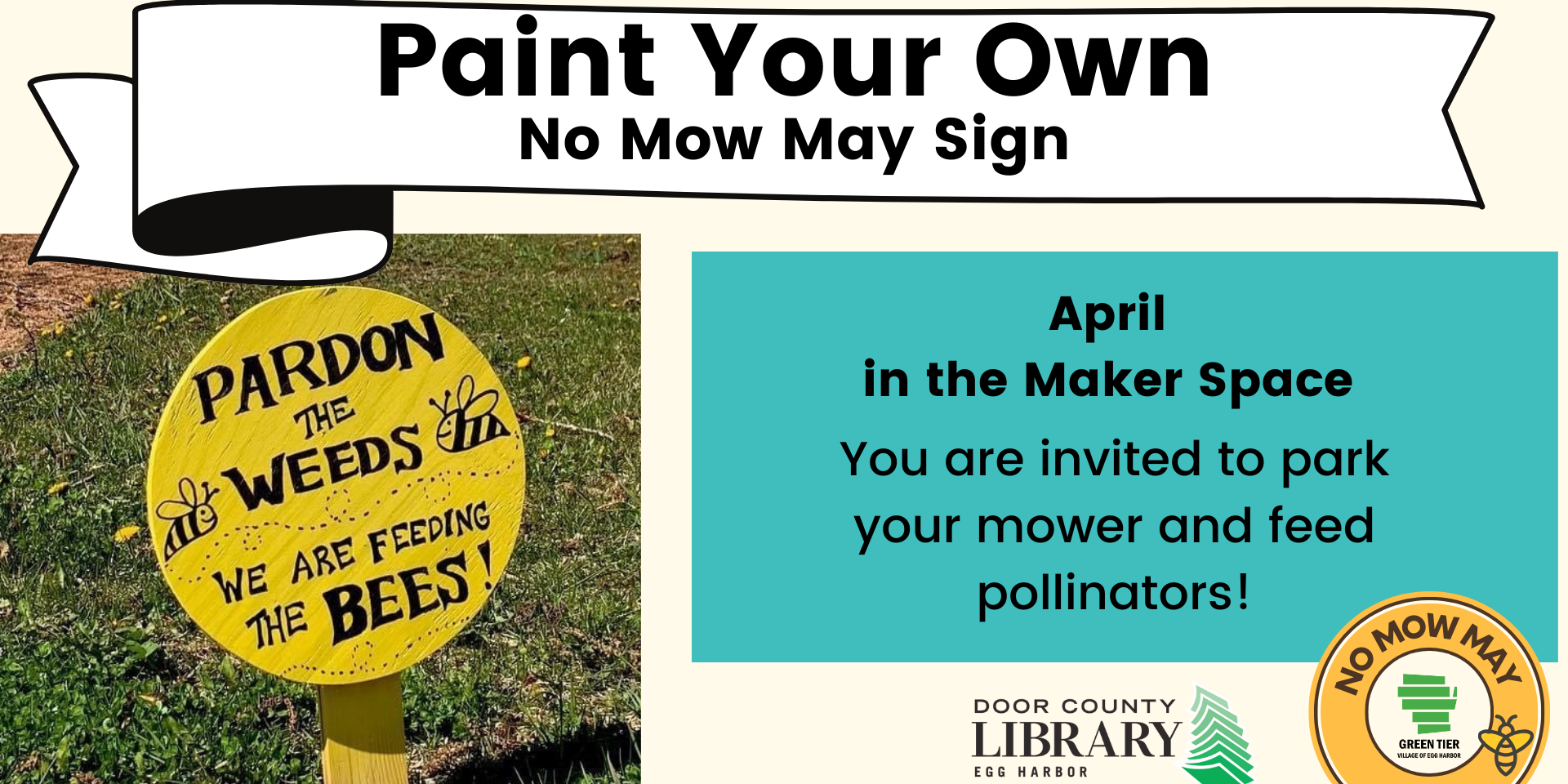 Want to participate in No Mow May? Help the pollinators! Stop into the Maker Space to create your very own No Mow May Sign! The signs are already assembled, you just need to write the words!